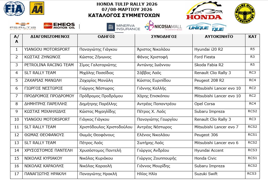 Με 17 πληρώματα να δηλώνουν συμμετοχή, το Honda Tulip Rally προμηνύεται ιδιαίτερα ανταγωνιστικό, καθώς οι κατηγορίες παρουσιάζουν έντονο ενδιαφέρον και αρκετές μονομαχίες που αναμένεται να κριθούν μέχρι τις τελευταίες ειδικές διαδρομές.